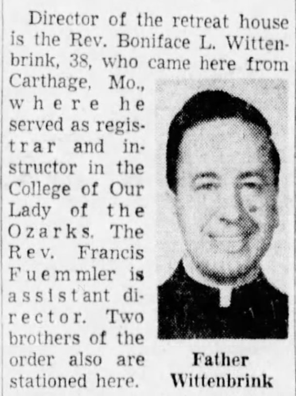 All nine of the children were raised in a community centered on St. Boniface Catholic Church. Max and Catherine Wittenbrink’s families–the Wittenbrinks, Wolffs, and Pautlers–worshiped at the church. They were married there, and their children were baptized at the parish. For the family, the local church felt like a second home, and early on, Boniface was particularly drawn to a religious calling. In a 2006 interview with the Progress Times, he reflected on a pivotal moment from his childhood that led him toward a career in the priesthood. In 1926, when he was twelve and attending school in Evansville, he learned that the local parish priest, Father J.B. Schlottmann, was retiring. Sitting at a pew during mass, he had a vision that he would follow in the retiring priest’s footsteps one day. Eventually, both he and his younger sister would commit themselves to a religious life.