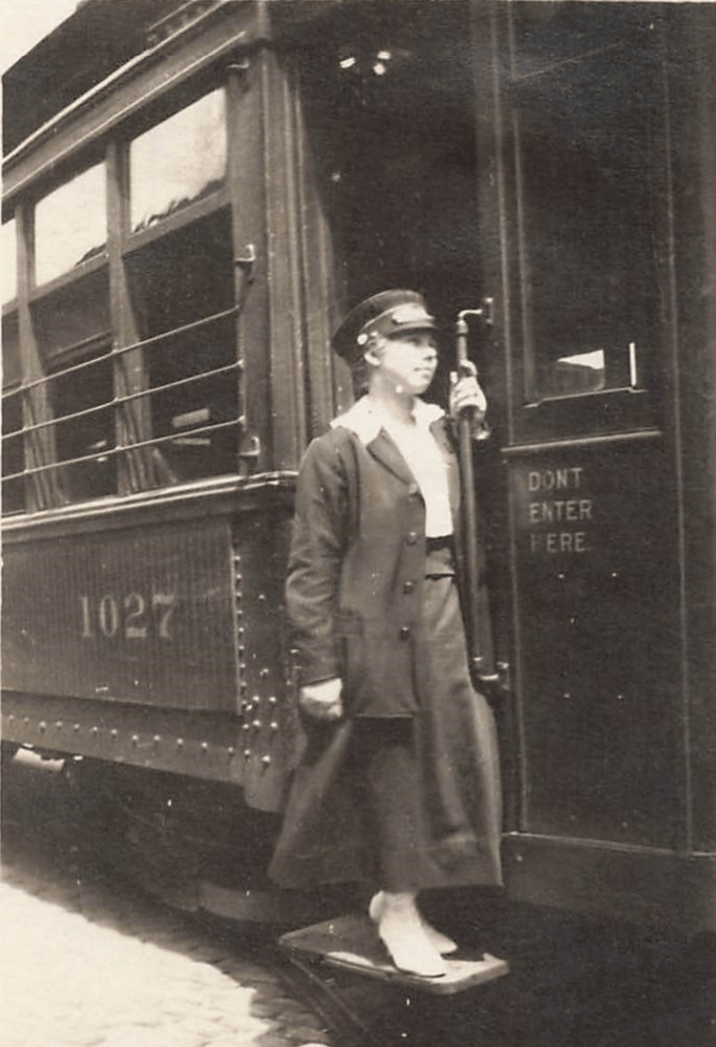 In her grief, Elizabeth decided to embark on a new life for herself. She left Red Bud for St. Louis, where she found a home on Geyer Avenue—and quickly found work in an unexpected profession. Initially planning to find work as a housekeeper, she instead became one of the city’s first female streetcar conductors, working on the Jefferson, Cherokee, and Tower Grove lines. As more and more men had volunteered for military service, the streetcar companies had opened up opportunities for women. The work was sometimes physically demanding, but Elizabeth was up to the task. She recalled that, on at least one occasion, her car was pulled off its track. She remembered, “I jumped out the back window and put the trolley back on line.” The job also allowed Elizabeth to use her social skills and her fearless attitude. Later in life, she joked with one journalist, “I liked the job because I could take people’s nickels and tell them where to get off.”