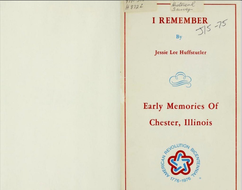 Jessie’s book, I Remember—Early Memories of Chester, Illinois, was published to coincide with the bicentennial in 1976. Then 88 years old, Jessie was dealing with increasing health issues, including arthritis and the linger effects of hip fractures. Her doctor and friend, John R. Beck, gave her a unique prescription: exercise her mind by channeling her memories into a memoir. She wrote a series of columns on her memories of old Chester in 1969 and 1970 for the Randolph County Herald-Tribune, which evolved into a book-length manuscript.