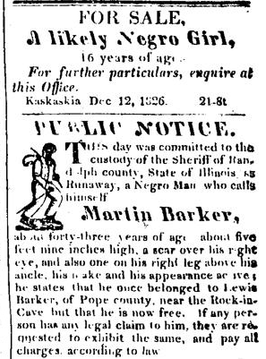On August 3, delegates from each of the territory’s counties held a meeting at Kaskaskia. According to John Reynolds, who became one of the first Justices of the Illinois State Supreme Court, the delegates were largely in agreement over various constitutional issues, but significant questions were raised about slavery. A considerable number of delegates owned enslaved or indentured people, including Jesse B. Thomas of St. Clair County (who was president pro tempore of the convention), Benjamin Stephenson of Madison County, Caldwell Cairns of Monroe County, Elias Kane of Randolph County, Conrad Will and James Hall of Jackson County, Michael Jones and Leonard White of Gallatin County, and Willis Hargrave of White County. Although Illinois entered the union as a free state, the committee sought compromise on the issue of slavery, permitting the practice to continue freely in the salt mines at Shawneetown, grandfathering in existing slaves (and only freeing their children when they reached adulthood), and retaining the territory’s system of indentured servitude. The constitution was signed at the end of August, and Illinois officially became a state in December 1818, around the time that Nance Legins turned five years old. The first governor of the state, Kaskaskia farmer Shadrach Bond, owned numerous slaves; so did the state’s first lieutenant governor, Pierre Menard, who was also a large landowner in Kaskaskia.