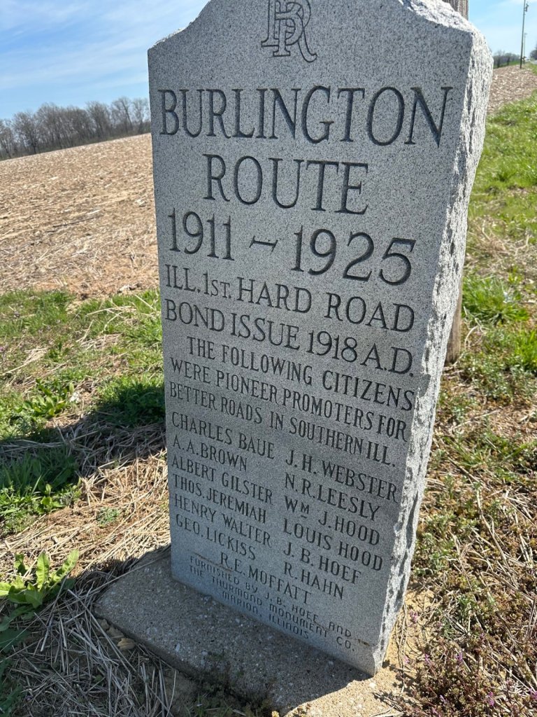One member of the Burlington Way Committee ensured that, even as the roads of the county changed and evolved, the early work that was done by the group to draw attention to the need for good roads would not be forgotten. John B. Hoef placed a granite monument along the planned Burlington Route (now Illinois 4) in Blair between Sparta and Steeleville, dedicated to the “hard road bond issue” of 1918. The text engraved on the marker reads, “The following citizens were pioneer promoters for better roads in Southern Illinois: Charles Baue, A.A. Brown, Albert Gilster, Thos. Jeremiah, Henry Walter, Geo. Lickiss, J.H. Webster, N.R. Leesly, Wm. J. Hood, Louis Hood, J.B. Hoef, R. Hahn, and R.E. Moffat.”